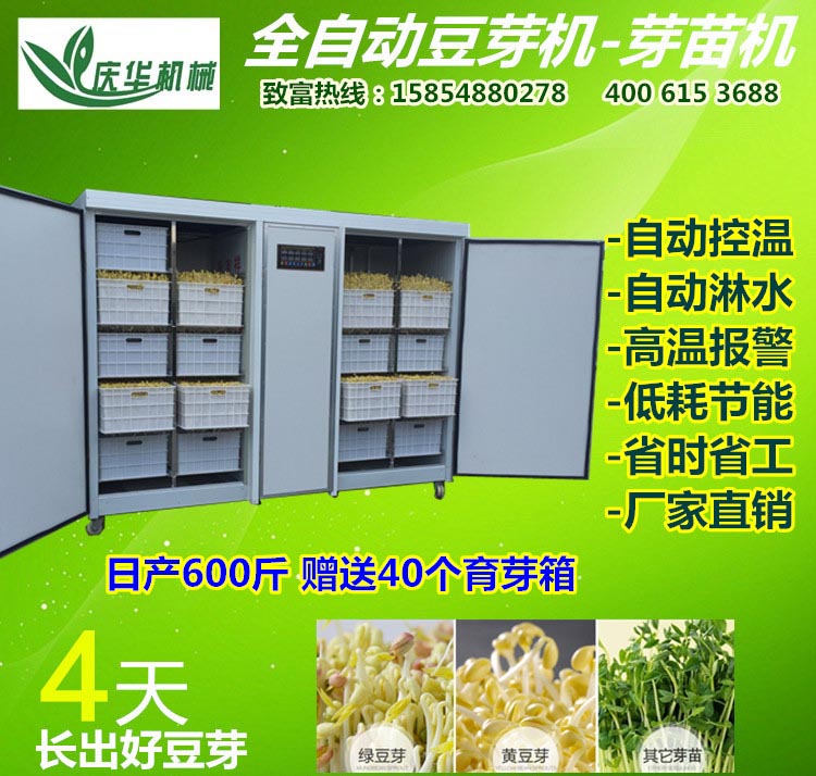 5、豆芽機產(chǎn)品特點: 1)我公司生產(chǎn)的全自動綠色無污染豆芽機,是現(xiàn)代技術與傳統(tǒng)工藝的結(jié)合。豆芽機通過微電腦自動控溫、自動加溫、自動顯示溫度、自動淋水,實現(xiàn)了生產(chǎn)過程的全自動化,具有省時、省工、低耗、無噪音等特點。 2)用我公司豆芽機生產(chǎn)的豆芽比傳統(tǒng)手工生產(chǎn)周期短質(zhì)量好,一般手工生產(chǎn)豆芽的周期,夏季需4-5天,冬季需要7-8天,而豆芽機生產(chǎn)豆芽只要3-4天即可,且不受地理環(huán)境、氣候條件和季節(jié)的影響。 3)我公司豆芽機生產(chǎn)的豆芽不僅種類多,而且產(chǎn)量高,一斤豆種可生產(chǎn)10斤左右的豆芽。且人工控制的環(huán)境下,豆芽生長均勻一致,潔白鮮嫩、清脆多汁,口感清爽;不僅食用安全、營養(yǎng)豐富,還具有一定的食療保健作用。 4)節(jié)省勞力,操作方便。將浸泡后的豆種放進豆芽機育芽箱內(nèi),就不用管了,它會自動加溫,自動淋水,經(jīng)過3-4天時間就可生產(chǎn)出潔白脆嫩的豆芽。 5)減少爛芽現(xiàn)象。豆芽生長的爛芽現(xiàn)象多發(fā)生在培育后的三天左右,由于手工生產(chǎn)豆芽的周期長,易出現(xiàn)爛芽現(xiàn)象,然而采用豆芽機生產(chǎn),三天左右豆芽已經(jīng)成熟,可以采收食用,不會有爛芽現(xiàn)象發(fā)生。
