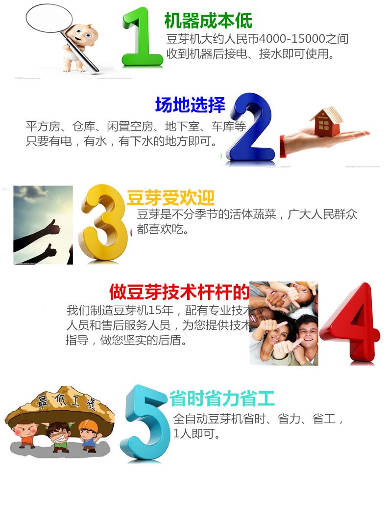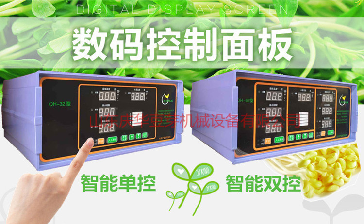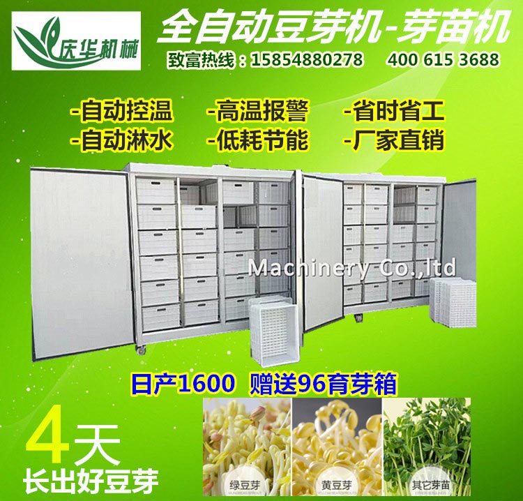 5、豆芽機產品特點: 1)我公司生產的全自動綠色無污染豆芽機,是現代技術與傳統(tǒng)工藝的結合。豆芽機通過微電腦自動控溫、自動加溫、自動顯示溫度、自動淋水,實現了生產過程的全自動化,具有省時、省工、低耗、無噪音等特點。 2)用我公司豆芽機生產的豆芽比傳統(tǒng)手工生產周期短質量好,一般手工生產豆芽的周期,夏季需4-5天,冬季需要7-8天,而豆芽機生產豆芽只要3-4天即可,且不受地理環(huán)境、氣候條件和季節(jié)的影響。 3)我公司豆芽機生產的豆芽不僅種類多,而且產量高,一斤豆種可生產10斤左右的豆芽。且人工控制的環(huán)境下,豆芽生長均勻一致,潔白鮮嫩、清脆多汁,口感清爽;不僅食用安全、營養(yǎng)豐富,還具有一定的食療保健作用。 4)節(jié)省勞力,操作方便。將浸泡后的豆種放進豆芽機育芽箱內,就不用管了,它會自動加溫,自動淋水,經過3-4天時間就可生產出潔白脆嫩的豆芽。